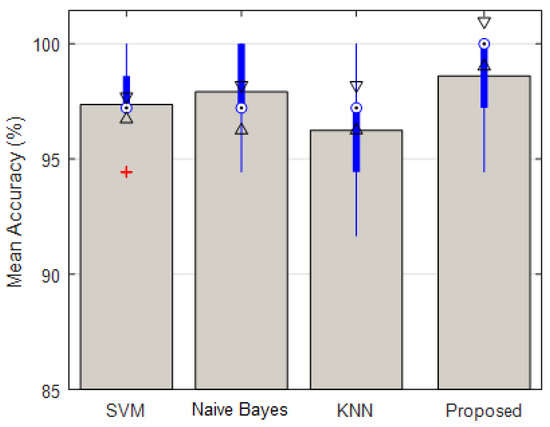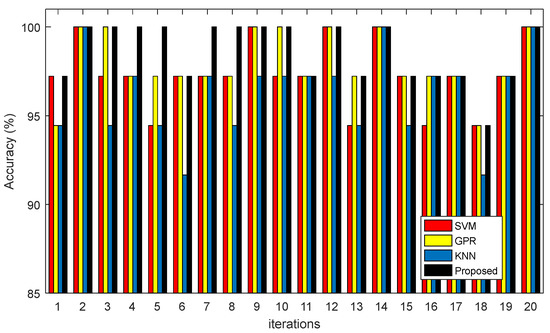 The results of the proposed model’s correct diagnosis for 20 repetitions of experiments are shown in Figure 7 and Table 3. In these results, the proposed ensemble system’s accuracy is compared to each of the algorithms used in it.