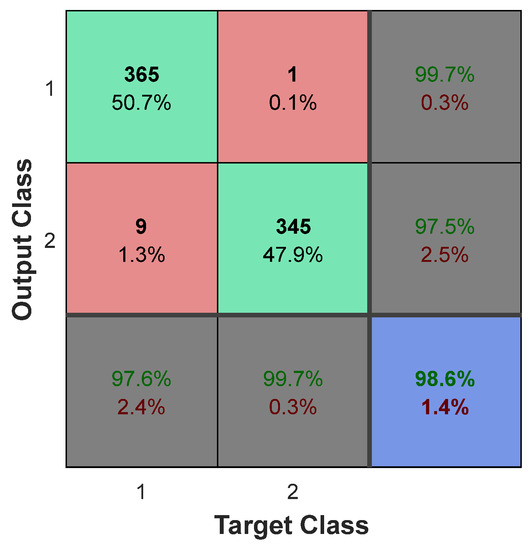 As shown in Figure 8, the proposed method has the advantage of having higher and tighter bounds of accuracy change during different iterations. These findings show that in more than cases, the accuracy of the proposed method was greater than 97 percent, and in other cases, its accuracy was between 94 and 95 percent. In the proposed model, Figure 9 illustrates the confusion matrix resulting from brain tumor diagnosis in the BRATS 2014 database. The row/column index 1 in this matrix denotes the category of normal samples, while the row/column index 2 denotes the category of tumor samples. The proposed method correctly classified 97.6% of normal samples (365 samples out of 374 normal test samples), as shown in this matrix.