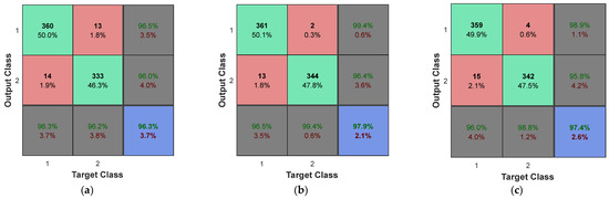The confusion matrices of (a) KNN, (b) Naive Bayes, and (c) SVM as the results of brain tumor diagnosis in BRATS2014 database.