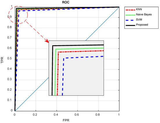 As shown in Figure 10, the ROC curve resulting from the proposed method results in higher TPR values and at the same time lower FPR values. These results show that by using the proposed method, fewer normal samples have been incorrectly diagnosed as tumor samples, and at the same time, more tumor samples have been correctly identified by the proposed method. Thus, the probability of correct diagnosis in the proposed method for the samples that are classified as cancerous is higher than the compared methods. The higher level of the ROC curve and more Area Under Curve (AUC) in Figure 10 confirms this point. Thus, the proposed ensemble system is effective in increasing the accuracy of classifiers in the diagnosis of tumors in brain MRIs.