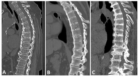 Sagittal CT reconstructions of the thoracic spine in three different patients: (A) a patient with DISH with thick, flowing, horizontally oriented, coarse osteophytes; (B) a patient with AS with slender, vertically oriented syndesmophytes; and (C) a patient with degenerative disc disease with horizontally oriented, non-flowing osteophytes. Note that the disc space is relatively preserved in the DISH subject, but not in the patient with a degenerative spine.