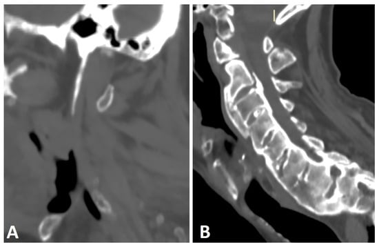 Sagittal CT reconstructions of the cervical spine of two patients with thoracic DISH (not shown). (A) The elongated styloid process results from calcification and ossification of the stylohyoid ligament. (B) Flowing osteophytes characteristic of DISH accompanied by OPLL.