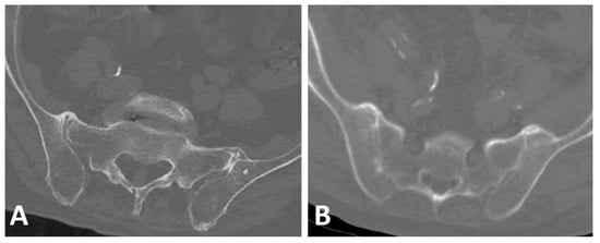 - Leibushor, N.; Slonimsky, E.; Aharoni, D.; Lidar, M.; Eshed, I. CT Abnormalities in the Sacroiliac Joints of Patients With Diffuse Idiopathic Skeletal Hyperostosis. Am. J. Roentgenol. 2017, 208, 834–837. [Google Scholar] [CrossRef] [PubMed]