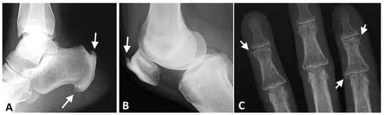 Appendicular DISH is characterized by the involvement of joints that are not commonly affected by primary osteoarthritis (e.g., elbows, shoulders, anterior chest wall, etc.) [32,78] as well as prominent, thick peripheral enthesopathies with calcification and ossification of extra-articular tendinous entheses such as in the tibial tuberosity, olecranon, and Achilles insertion (Figure 9) [79]. In addition, the affected joints in DISH show the exuberant new bone formation and para-articular osteophytes [66]. These changes may result in a reduced range of motion in the affected joints and potentially the subsequent development of degenerative changes [4,75,79].
