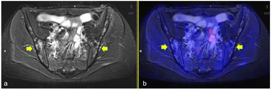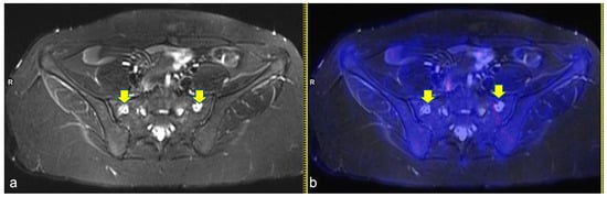 Axial turbo inversion recovery magnitude (TIRM) image (a) and fused axial TIRM and [18F]FDG-positron emission tomography (PET) (b) of the PET/MR scan of a 17 year-old girl affected by Hodgkin’s lymphoma, performed for re-evaluation after chemotherapy (ERA-PET), clearly demonstrating the presence of symmetric ischemic lesions in the sacrum (yellow arrows in (a)) without pathologic uptake.