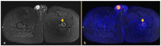 Axial turbo-inversion recovery magnitude (TIRM) image (a) and fused axial TIRM and [18F]FDG-positron emission tomography (PET) (b) of the PET/MR scan of a 13 year-old boy affected by Hodgkin’s lymphoma, performed for re-evaluation after chemotherapy (ERA-PET), clearly demonstrating the presence of an ischemic lesion in the left femur (orange arrow in (a)) with mild, focal uptake (SUVmax 2.4, orange arrow in (b)).
