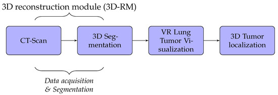 In our case, we used algorithms developed in [2,21,22] to implement segmentation and 3D reconstruction parts of lung cancer. The results obtained are not the subject of this paper. Thus, the 3D-RM module will not be presented. We, essentially, focused on the VR part which includes VRIM and 3DL modules.