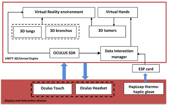 Figure 2 shows the general diagram developed in the Unity game engine. It illustrates the main components of the VR application that developed using Unity 3D/Unreal Engine. In this case, we integrated several packages: the virtual environment package, which integrated optional 3D objects of the scene, such as walls, tables, lamps, paintings, etc.; three packages for 3D lungs design (3D lung models, 3D bronchus models, and 3D tumor models); interaction package for human–computer interaction management; and data manager package for data exchange between packages and 3D scene updates.