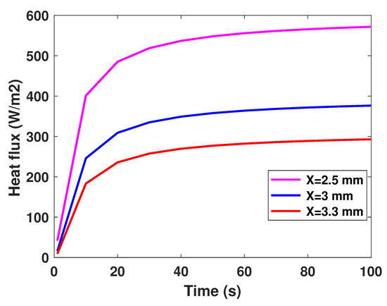 It is well established that the value of temperature at the tumor tissue is around 40 °C [29], where the variation of initial temperature values, namely (T1 = 39°, T2 = 40°, T3 = 41°). From Figure 3, one can observe the proportionality of the variations of temperature compared to the initial values, where the temperature of lung tumor converges toward a value slightly higher than the initial value. The perceived temperature difference is relatively homogeneous and varies approximately between 1 °C and 3 °C from the initial temperature. In a second part, to perceive and estimate the thermal sensation during the interaction with the tumor through the glove, we were interested in the study regarding the variation of the thermal flux. It is well known that the heat flux exchange is considered a significant indicator of the heat perceived by the patient [26]. For this, we applied several sizes or thicknesses of tumors to see the variation of the heat flux (as illustrated in Figure 4). Three different values of size have been considered, namely 2.5 mm, 3 mm, and 3.3 mm. As first reflection (from Figure 4), one can note that the heat flux is inversely proportional to the tumor thicknesses. One can also notice the presence of a first short phase (does not exceed 10 s) characterized by a considerable increase, then a second phase of convergence.