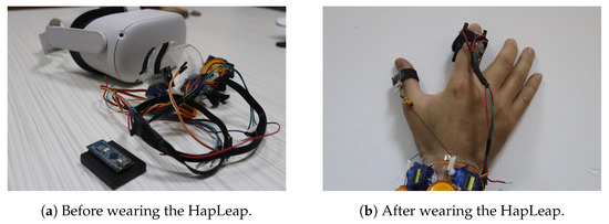 Researchers have proposed different prototypes for smart wearables in virtual reality. The developed bracelets were managed by heavyweight, bulkiness and a wired external control system. Additionally, few dimensions of sensations were provided to users. In our case, we proposed the HapLeap optimized wearable grasping device (see Figure 6) to stimulate the user’s hand with three types of sensations: kinesthetic, cutaneous and thermal feedbacks. HapLeap is a real-time hand thermo-haptic glove for stimulating the physical materials behavior in a virtual environment. Hapleap is equipped with vibrotactile tactors that generate vibrations through user’s fingers when a 3D tumor inside a 3D infected lung of a patient is touched and/or grasped. For the second situation, the fingers motion will be blocked to simulate the force effect on the hand. For the thermal effect, Peltier modules are used to simulate the temperature of the object being interacted with. Thus, the thermal display is integrated to the glove’s fingertip, allowing the user to feel thermal sensation (cold and hot) when touching and/or grasping a 3D tumor corresponding to a patient.