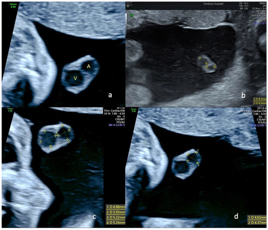 Ultrasound views of the free portion of the umbilical cord in a fetus with single umbilical artery at 22 weeks of gestation; (a) transverse view of the free loop showing the remaining artery (A) and the umbilical vein (V); in pictures (b–d), we can see different measurements of arteries and veins in a transverse view of a free loop of umbilical cord at 22 weeks in fetuses with SUA.