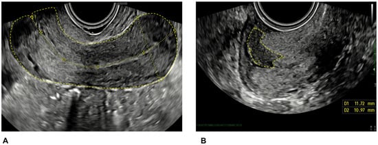 Ultrasound scan image showing the uterus (A) and tumor (B) diameters in two dimensions.