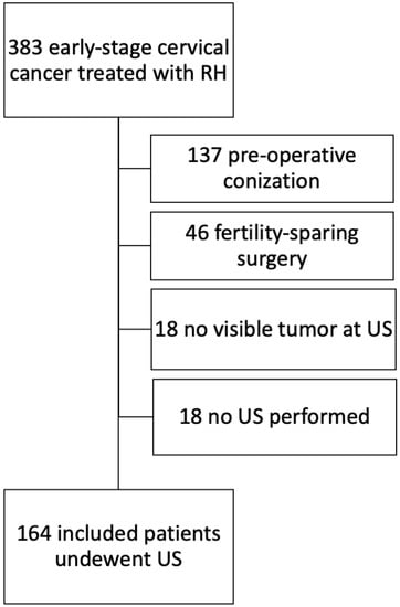 This is a retrospective, single-center, observational cohort study, approved by the Institutional Review Board (number DIPUSVSP-27-07-2086 on 27 July 2020) at Fondazione Policlinico Universitario A. Gemelli, IRCCS (Rome, Italy). Consecutive patients with clinical International Federation of Gynecology and Obstetrics (FIGO) 2018 stage IA1–IB2 and IIA1 [13] cervical carcinoma, treated by primary radical surgical treatment with curative intent, between February 2012 and June 2019, at Fondazione Policlinico Agostino Gemelli IRCCS, Rome, Italy, were included. Only patients with available ultrasound examination performed within two weeks before surgery were included. Data were retrieved from the institution’s electronic database. Patients who underwent neo-adjuvant treatment, fertility sparing surgery, and pre-operative conization were excluded.