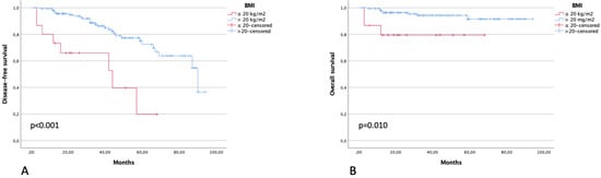 DFS (A) and OS (B) in patients with BMI of ≤20 and >20 kg/m2.