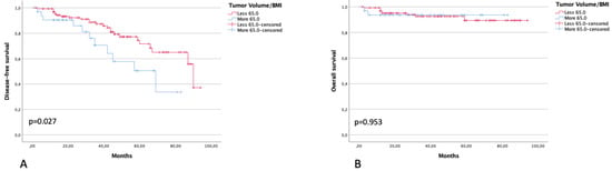DFS (A) and OS (B) in patients with a ratio between tumor volume at US and BMI of ≤65 and >65.