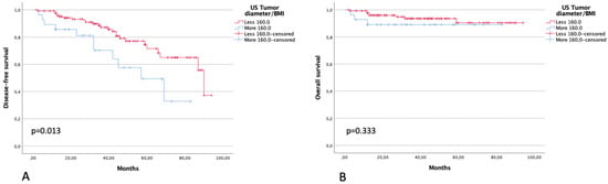 Three-year DFS in patients with a ratio between ultrasound largest tumor diameter and BMI of <160 and >160 was 87.1% and 70.4% (p = 0.013), respectively. Three-year OS in patients with a ratio between ultrasound largest tumor diameter and BMI of <160 and >160 was 93.6% and 89.1% (p = 0.333), respectively (Figure 5).