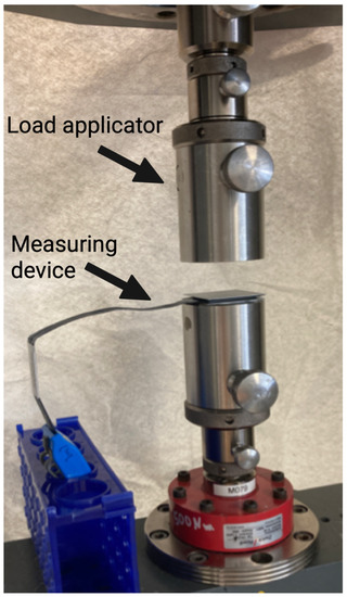 Set-up for validation measurement using the universal testing machine. Arrows indicate the load applicator and the measuring device. The measuring device is positioned without any preload and then loaded according to different protocols.