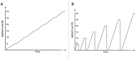 Schematic visualization of testing protocols. Simplified schematic demonstration of the two different protocols, which were used to simulate bite force measurements. A continuously increasing, stepped vertical load (A) and a cyclic increasing vertical load (B) were used for validation measurements. Created with Biorender.com.