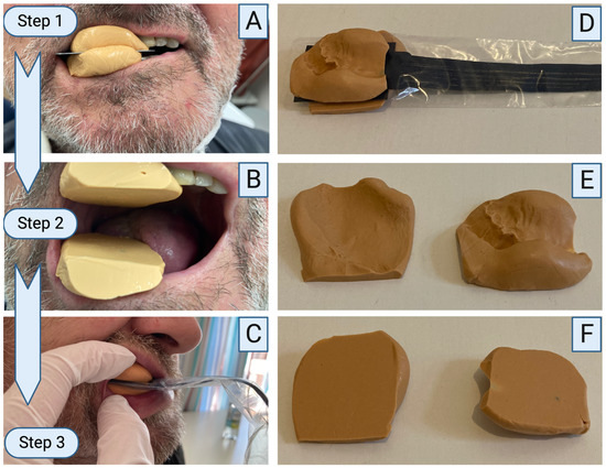 Bite force measuring device and its clinical application. Two silicone bulges are placed on the upper and lower jaw. The lower jaw is edentulous. A metal plate is placed in between, and the patient is asked to bite together. The patient is instructed to keep biting until the silicone hardened (A). The metal plate was removed, and two flat surfaces were created (B). The measuring device inside a protection cover is placed in between the flat silicone bulges, and the patient is instructed to clench the teeth together. Bite force can be recorded (C). After measurement, the complete set-up can be removed (D). The silicone allows complete individualization to the upper and lower jaw even in edentulous situations (E). Flat surfaces are directed to the sensor to guarantee protection of the sensor (F). Created using Biorender.com.