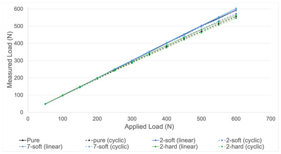 Validation measurements using four different set-ups. Measured load by the device in relation to the applied load by the testing machine is shown. Four different set-ups (pure, 2-soft, 7-soft, 2-hard) were tested with both linear (dotted lines) and cyclic (continuous lines) increasing loads (N) until 600 N.
