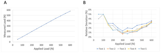 Reproducibility measurements. The average measured load of five repetitive measurements using group “2-soft” and cyclic dynamic loading until 600 N is presented (A). Standard deviations are presented by black error bars for each load step. The insignificant variances between repetitive measurements are further demonstrated by relative deviations (%) of the measured force in relation to the applied load by the testing machine (B).