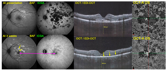 Multimodal imaging in APMPPE combining BAF, ICGA and OCT/EDI-OCT. This combination of invasive (ICGA) and non-invasive methods (BAF and OCT/EDI-OCT) gives a precise appraisal of the condition. BAF at presentation (top left) still showed minimal changes despite the extensive choriocapillary non-perfusion shown on ICGA (top middle), because the overlying RPE and outer retina were still at an edematous stage, as shown on OCT/EDI-OCT (top right). Three weeks later, after the partial re-perfusion seen on ICGA (bottom middle), the damaged areas were visible on BAF (bottom left). In the center, there was hypoautofluorescence corresponding to remaining non-perfusion on ICGA (crimson arrow). The bright hyperautofluorescent areas correspond to both suffering RPE cells with accumulated fluorophores and to the loss of photoreceptor outer segments, as shown on OCT/EDI-OCT (bottom right) (yellow arrows). OCT-A did not yield additional information, showing the same non-perfusion areas as seen on ICGA (choriocapillary drop out), limited to the central macular area, but was useful in the follow-up of these central damaged areas (also see Figure 3). (Far-right) OCT-A images at presentation (top right) and after 3 weeks (bottom right).