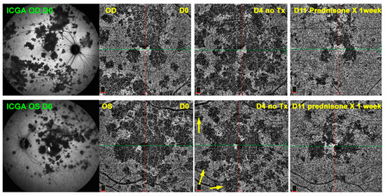 OCT-A follow-up of APMPPE. Example of practical usefulness of OCT-A in a patient with APMPPE (same patient as Figure 1). At presentation, ICGA frames clearly establish the global involvement of the fundus. To monitor the evolution of lesions and the impact of therapy, OCT-A allowed a close follow-up, although only of the central lesions (6 frames to the right). Yellow arrows show new areas of drop-out before regression of lesions following introduction of corticosteroids (frames at the extreme right).