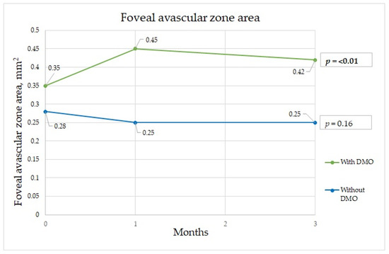 The FAZ is a specialized region of the human retina that usually has the highest cone photoreceptor density and oxygen consumption. In the study of Chandrakumar Balaratnasingam et al., it is suggested that the FAZ has great utility as the structural unit of visual function among patients with diabetic retinopathy [19]. Boned Murillo et al.’s systematic review of aggregated data concluded that in patients with diabetes mellitus (both type 1 and type 2 diabetes mellitus patients) without clinical diabetic retinopathy, the FAZ and areas of capillary nonperfusion were increased; these results suggested that FAZ metrics may have prognostic value in diabetic retinopathy progression, impending DME, and overall visual acuity [20]. In that study, none of the FAZ metrics differed in terms of severity of diabetic retinopathy, indicating that they do not play a crucial role in advanced diabetic retinopathy, though they may have prognostic value in predicting changes in such parameters [20]. Comparing patients with a normal retina to those with macular edema, we found a significant difference in the FAZ area at one and three months after surgery between the two groups. The FAZ area was almost twice as wide in patients with macular edema than in those without edema at one month after surgery, which implies that ischemia was induced by surgery. Although at three months after surgery, the FAZ area in the group with DME had diminished slightly, it was still significantly wider than that in those without DME (Figure 1). The FAZ area decrease cannot be unequivocally attributed to diabetes, because Zhao et al. showed a decrease in the FAZ area that remained three months postoperatively in nondiabetic patients. This may well be because of intraocular pressure fluctuations during surgery, postoperative inflammation, which is a normal reaction after this intervention, and an increase in light exposure during and after cataract surgery [21]. Very similar results were obtained for the FAZ perimeter, although the perimeter was significantly different between the groups before surgery; greater irregularity was detected among patients with DME (Figure 2). In some studies, irregularity of the FAZ perimeter is mentioned as an ischemic factor. In Gildea et al.’s systemic review, the full-thickness FAZ area in type 2 diabetes patients with no retinopathy increased from 0.33–0.41 mm2 as diabetic retinopathy deteriorated [22]. However, in our study, the FAZ area in diabetes patients without DME was lower. Visual changes are shown in Figure 4. In diabetic retinopathy patients with DME, the full-thickness FAZ area ranged from 0.47–0.76 mm2, which was comparable to that in our study. However, in Feng et al.’s 2021 study, the FAZ area in the diabetic group was smaller than that in the nondiabetic group, but the difference was nonsignificant [3]. Additionally, the FAZ perimeter was very similar in both groups. This suggests that this metric is controversial.