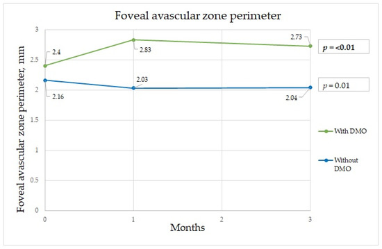 In patients without DME, the parameters that significantly differed among the time points were BCVA, FAZ area, FAZ perimeter, mean perifoveal density in the deep capillary plexus (shown in Figure 1, Figure 2 and Figure 3), and central retinal thickness (Table 2).