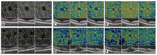 Vascular changes on OCT angiography. The scan area is 6 mm × 6 mm. Upper panel: patients without DME; lower panel: patients with DME. (A,B) FAZ changes showing distorted circularity among DME patients. (C,D) Vascular density changes in the superficial capillary plexus in parafoveal and perifoveal regions. (E,F) Vascular density changes in the deep capillary plexus in parafoveal and perifoveal regions during the three-month period. In color-coded maps warmer colors represent higher vascular density and numbers show vascular density in percentage.