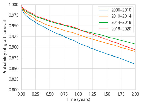 Figure 2 presents the evolution of the two-year renal survival probability at different time intervals for the UNOS database. The progressive improvement in the probability of graft survival is evident since 2006, reaching the highest differences between the period 2006–2010 and 2014–2018. It is expected that this trend will continue in the following years due to the Immuno Bill, mentioned in Section 1. These differences in behaviour between years are not observed for SICATA for the same time intervals.