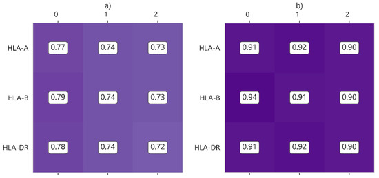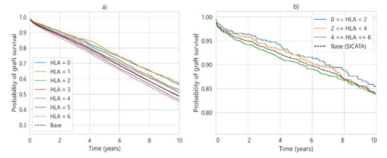 The 10-year survival probability for UNOS (a) and SICATA (b) considering aHLA is presented in Figure 6. Given the scarcity of data for SICATA, three groupings have been chosen instead of six, while in UNOS, one grouping is maintained for each aHLA value.