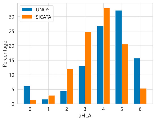 Survival analysis for aHLA (HLA-A + HLA-B + HLA-DR), with values between 0 and 6, which offers differences in behaviour as pointed out by some authors [17,18]. Figure 5 shows the distribution of cases by percentage considering the different aHLA values in UNOS and SICATA. The most notable differences between UNOS and SICATA are seen at all levels, where UNOS reaches a higher percentage in incompatibilities 0 and 6 compared to SICATA, while in SICATA, the highest percentages compared to UNOS are in the intermediate values.