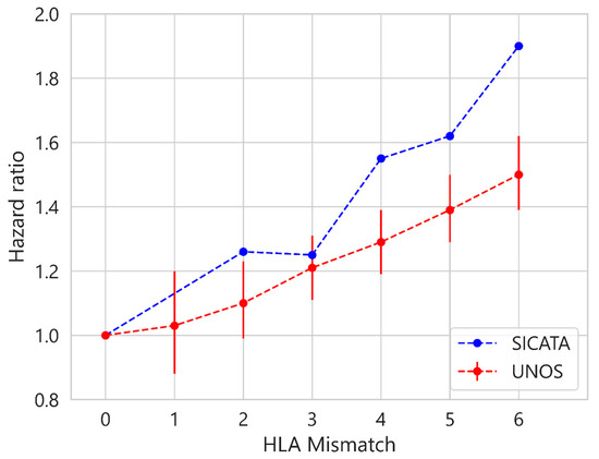 Finally, Figure 8 shows the hazard ratio obtained from a univariate Cox model for each of the aHLA levels, taking 0 as the reference value. For SICATA, the value 1 has been omitted due to the scarcity of data for this level. The linear relationship of hazard ratios in UNOS as aHLA increases was obtained by other authors [20], although with older data (up to 2013). This linear trend is also observed for SICATA, with the hazard ratio being higher than in UNOS at all levels, although statistically insignificant (p > 0.05). The error bars are the 95% confidence intervals for each value of the hazard ratio, omitted for SICATA given the magnitude of these.