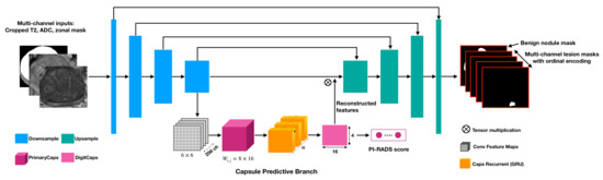 As shown in Figure 2, a multi-task network MiniSegCaps with two predictive branches was proposed for detecting and classifying lesions. A concatenation of T2W, ADC, and zonal mask creates the model’s three-channel inputs. The decoder was one output branch trained for predicting lesion masks and PI-RADS scoping categories under the supervision of ordinal encoded lesion and BPH masks. Another output branch using two capsule layers (caps-branch) was attached to the end of the encoder to produce specific malignancy, i.e., low-grade or high-grade lesion. Reconstructed feature maps from the caps branch were also integrated into the decoder as an attention map to improve the performance of the decoder branch.