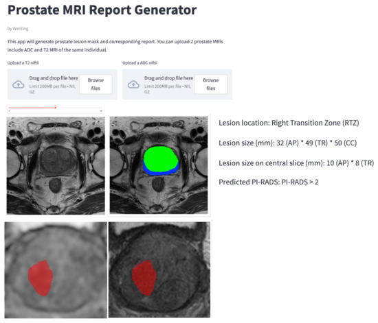 GUI components support image processing toolboxes, picture archiving integration, and integration of deep learning libraries. For clinical AI applications of prostate cancer diagnosis, GUI components included prostate cancer segmentation, PI-RADS classification, and quantification. GUI was deployed with Streamlit software (version 1.2.0, https://streamlit.io/, accessed on 1 May 2022), integrating image processing toolboxes for image preprocessing and postprocessing and training deep learning models for zonal segmentation, lesion segmentation, and PI-RADS classification.