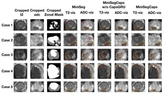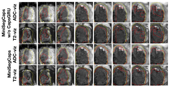 Figure 4 illustrates a visual comparison of the cropped T2, cropped ADC, cropped zonal mask, lesion ground truth (yellow contour), and predicted lesion mask by MiniSegCaps (red contour) on T2 and ADC images among five different cases. Our model successfully produced satisfactory segmentation of prostate cancer and revealed the spatial relationship between the zonal mask, lesion on T2, and ADC, which might help lesion location and classification. We also obtained consistent segmentations across adjacent slices within one volume, as shown in Figure 5. The results indicate that CapsGRU in MiniSegCaps helped capture spatial information and achieve better segmentations across adjacent slices.