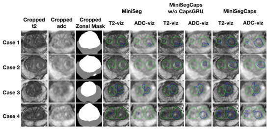 Moreover, the results of benign nodule segmentation shown in Table 4 indicate that our model achieved the best performance among these algorithms. Figure 6 also shows a visual comparison of benign nodule ground truth (green contour) and predicted segmentation (blue contour) by deep learning models on T2 and ADC images among different cases.