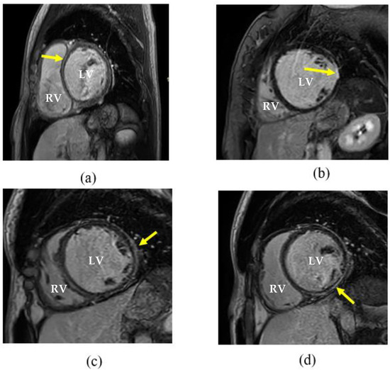 Late gadolinium enhancement cardiovascular magnetic resonance images showing the left and right ventricle. (a) Dilated cardiomyopathy with midwall enhancement of the septum (arrow); (b) subendocardial enhancement in the lateral ventricle free wall, typically associated with ischaemic heart disease; (c) shows an epicardial enhancement pattern in the lateral ventricle free wall and (d) inferior segment. LV = left ventricle; RV = right ventricle.