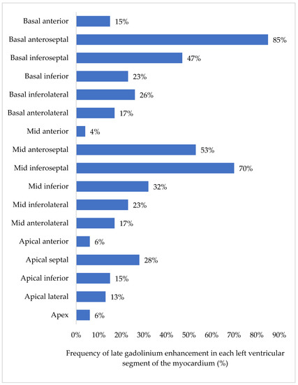 Distribution of late gadolinium enhancement in the left ventricular myocardial segments. The bars demonstrate the percentage of segments with LGE. In 85% of IDCM patients, LGE was visualised in the basal anteroseptal segment. There were 46 IDCM patients with LGE in one or more segments; therefore, the cumulative percentage will be >100%.