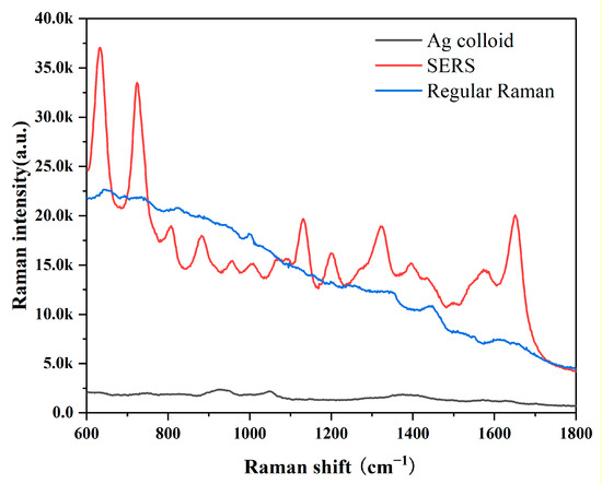 In this investigation, the Ag colloid served as an improved substrate. The results of an Ag nanoparticle (NP) UV absorption spectra and transmission electron microscopy micrograph with a 50-nm bar are shown in Figure S2. The UV absorption spectra at a high absorption peak of 417 nm demonstrated the purity of these Ag NPs [35]. Ag NPs used in this measurement had excellent purity. We obtained the SERS and Raman spectra from the same GB-stone serum patient to demonstrate the boosting effects of the Ag colloid. SERS signals were evident, as shown in Figure 1, demonstrating that our Ag colloid considerably enhanced the serum’s Raman spectra. Therefore, as a substrate, the Ag colloid may be more effectively used.