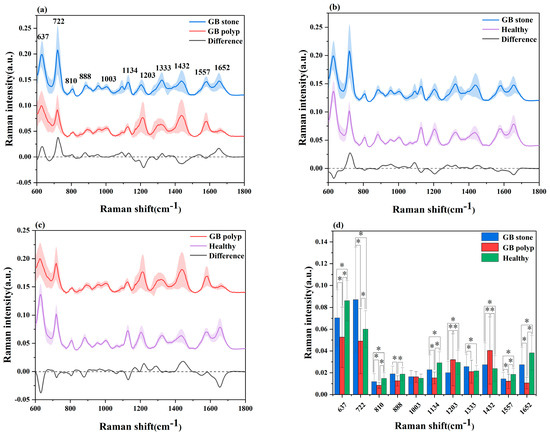 (a) Comparison of average SERS spectra of a GB stone and GB polyp patients, (b) GB stone and Healthy objects, (c) GB polyp and Healthy objects. The shaded areas represent the standard deviations of the means. In addition shown at the bottom is the difference spectrum. (d) The corresponding histograms of the average intensities and standard deviations of SERS peaks among the three groups. * p < 0.05.