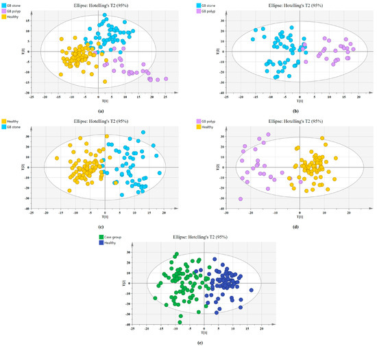 Principal component score plots of the SERS spectra based on OPLS-DA. (a) Score plot for Healthy, GB stone, and GB polyp serum samples. (b) Score plot for GB stone, and GB polyp serum samples. (c) Score plot for Healthy, and GB stone serum samples. (d) Score plot for Healthy, and GB polyp serum samples. (e) Score plot for Healthy, and Case group* serum samples. (*Case group, GB stone, and GB polyp Group).