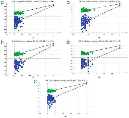 100-permutation test of the SERS data for three types of serum based on OPLS-DA. (a) Healthy, GB stone, and GB polyp classification models. (b) GB stone vs. GB polyp classification models. (c) Healthy vs. GB stone classification models. (d) Healthy vs. GB polyp classification models. (e) Healthy vs. Case group classification models.