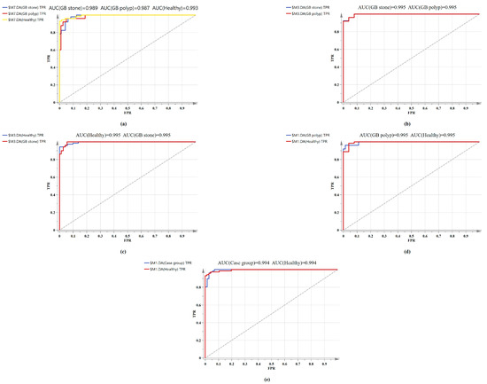 Comparison of ROC curves of serum SERS spectral utilizing the OPLS-DA algorithm. (a) Healthy vs. GB stone vs. and GB polyp serum samples. (b) GB stone serum samples vs. GB polyp serum samples. (c) Healthy serum samples vs. GB stone serum samples. (d) Healthy serum samples vs. GB polyp serum samples. (e) Healthy serum samples vs. Case group serum samples.