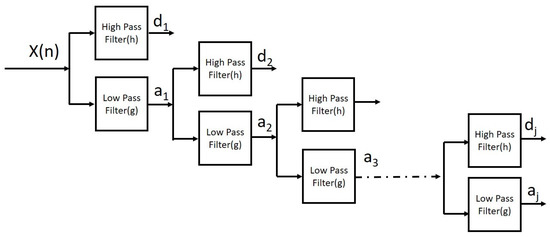where and are the filter functions, t = 0, … N − 1, N is the length of signal samples, and l = 0, 1, … L − 1, and L is the width of the filter. The jth level of detail and approximation coefficients are: