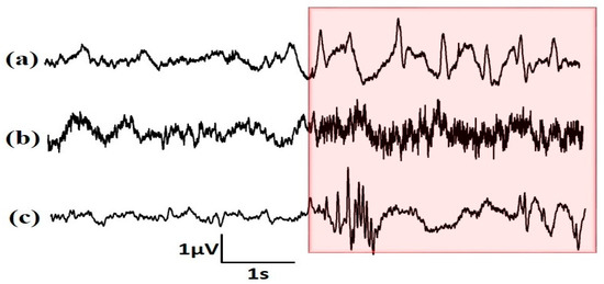 Representative EEG channel of (a) EGSZ, (b) CPSZ and (c) TCSZ. The electrical activities of brain from onset are highlighted in the box.
