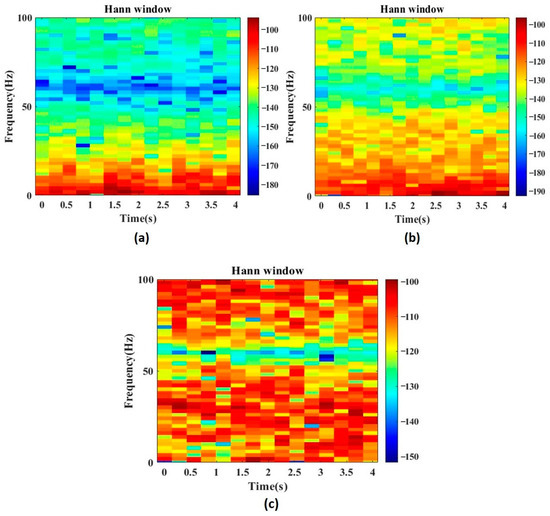 Spectrogram of (a) EGSZ, (b) CPSZ and (c) TCSZ. Hann window function is used to extract power spectrum of the signals. Colors indicate the intensity of power component with respect to frequency.