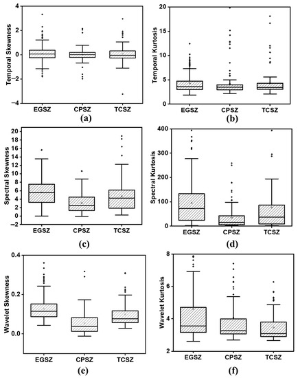 Figure 6 presents the distribution of temporal, spectral, and wavelet skewness and kurtosis extracted from the window length of 0.5 s with 50% overlap. The box plot shows the distribution of average skewness and kurtosis computed from each EEG channel. The median of skewness and kurtosis are found to be higher in EGSZ than TCSZ and CPSZ in spectral and wavelet domain. In the case of temporal skewness and kurtosis, only a very little difference can be seen in the median values among seizure types. It is also noticed that the percentage of overlap in temporal measures is higher than in spectral and wavelet measures. The results of the ANOVA test show that all the extracted features except the temporal kurtosis and skewness are found to have significant difference between the seizure types (p < 0.05). The number of EEG channels in the different seizures seemed to be highly imbalanced, and therefore, the development of detection models will lead to unreliable performance. There are several solutions for handling the class imbalances. These include techniques such as undersampling and oversampling. In the undersampling technique, we randomly select a number of samples from the majority class, whereas oversampling entails creating artificial examples of the minority class. The synthetic minority oversampling technique and adaptive synthetic algorithms are examples of oversampling [34].