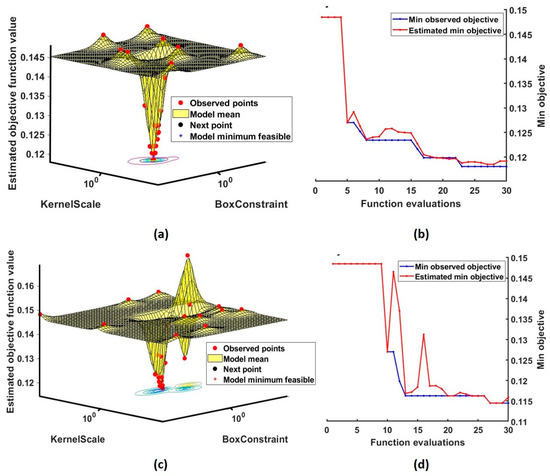 Bayesian optimization of hyperparameters of RBF-SVM. (a,b) represent the optimization process of wavelet skewness and (c,d) represents the minimization process of wavelet kurtosis. The objective function values, kernel parameters in 30 evaluations are shown.